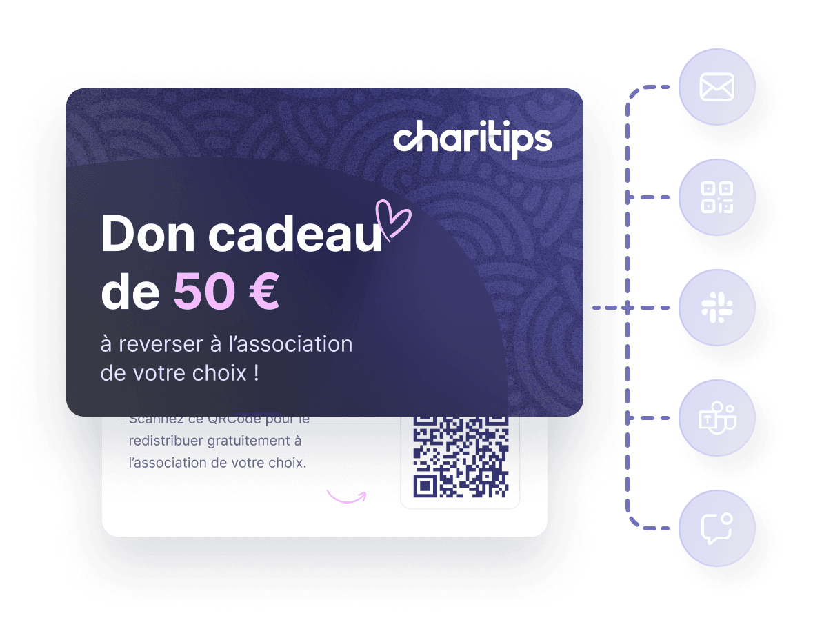 Laissez Charitips envoyer vos cartes cadeaux caritatives par e-mail, Slack, Teams, Notification Push… ou via l’une des +5000 applications auxquelles nous sommes connectés !