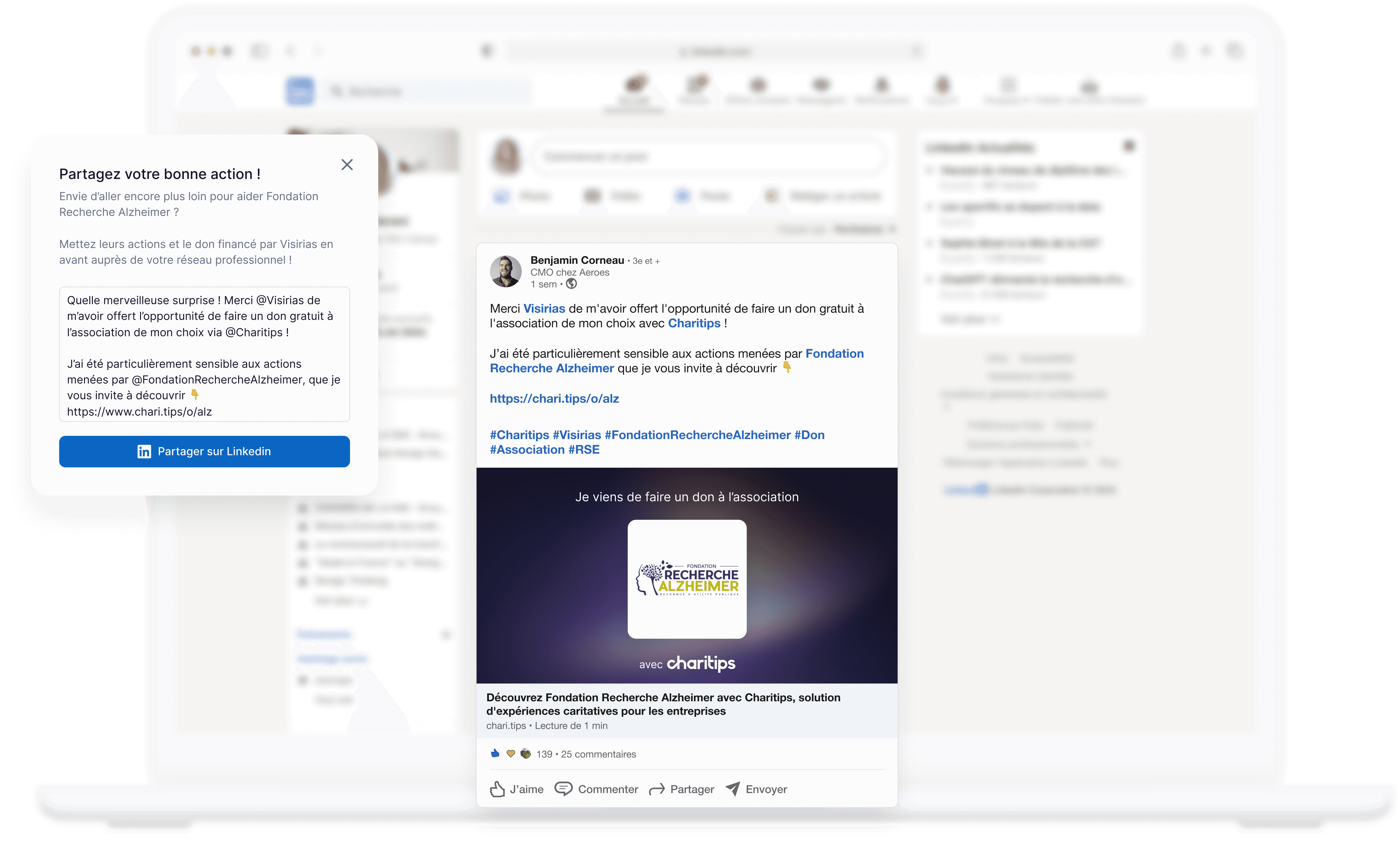 Permettez à vos bénéficiaires de partager et valoriser leur action sur les réseaux sociaux avec du contenu personnalisé mentionnant votre entreprise.