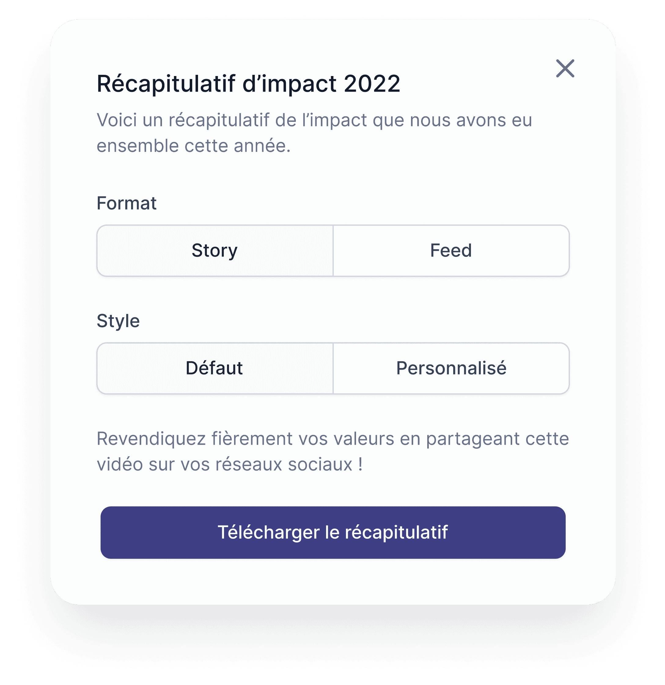 Un récapitulatif d’impact vidéo à vos couleurs est automatiquement généré. Partagez fièrement le résultat de vos initiatives à votre communauté.