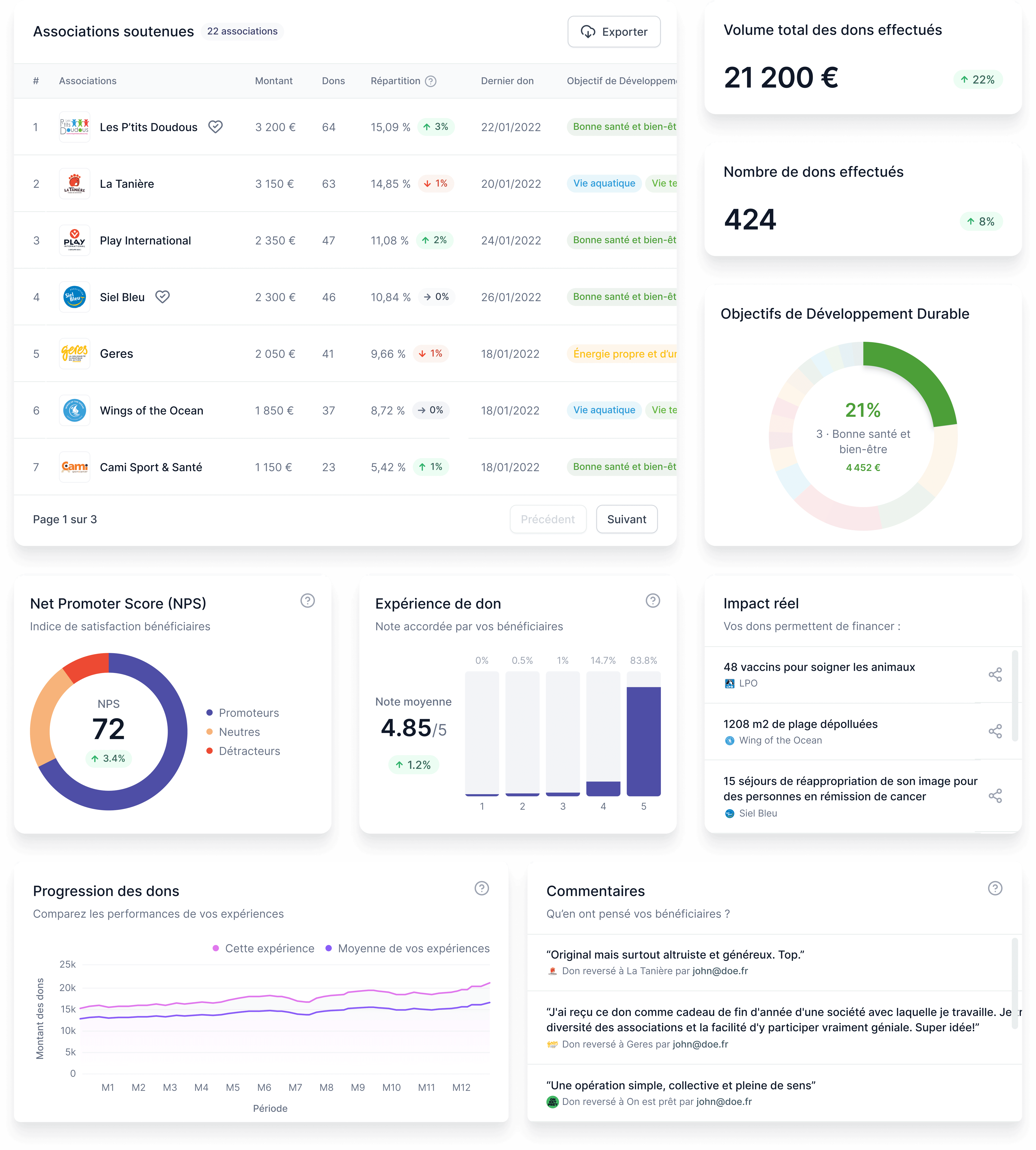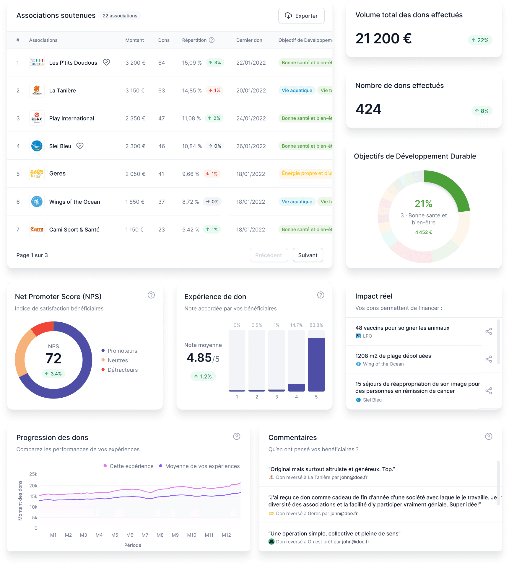 Partages sur les réseaux sociaux, commentaires, Net Promoter Score (NPS)… Charitips prouve l’intérêt de vos bénéficiaires en temps réel.