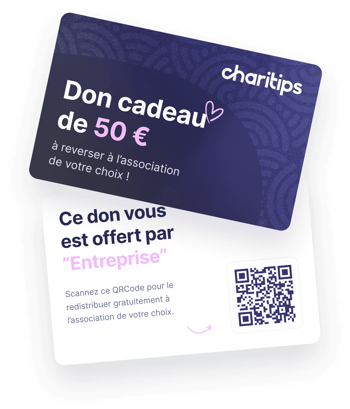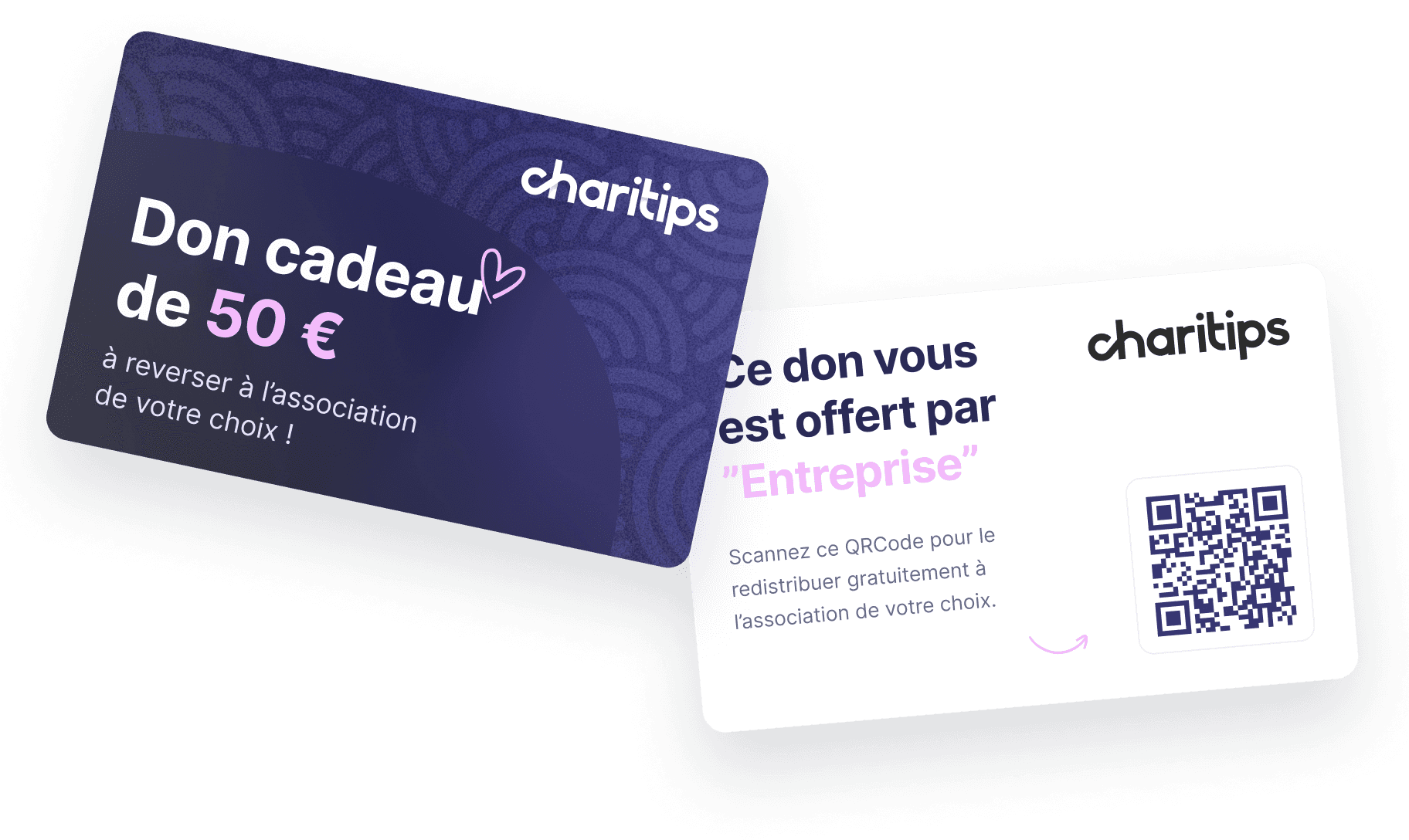 Laissez Charitips envoyer vos dons par e-mail, Slack, Teams, Notification Push… ou optez pour un format digital ou physique (carte avec QRCode) à distribuer vous-même !